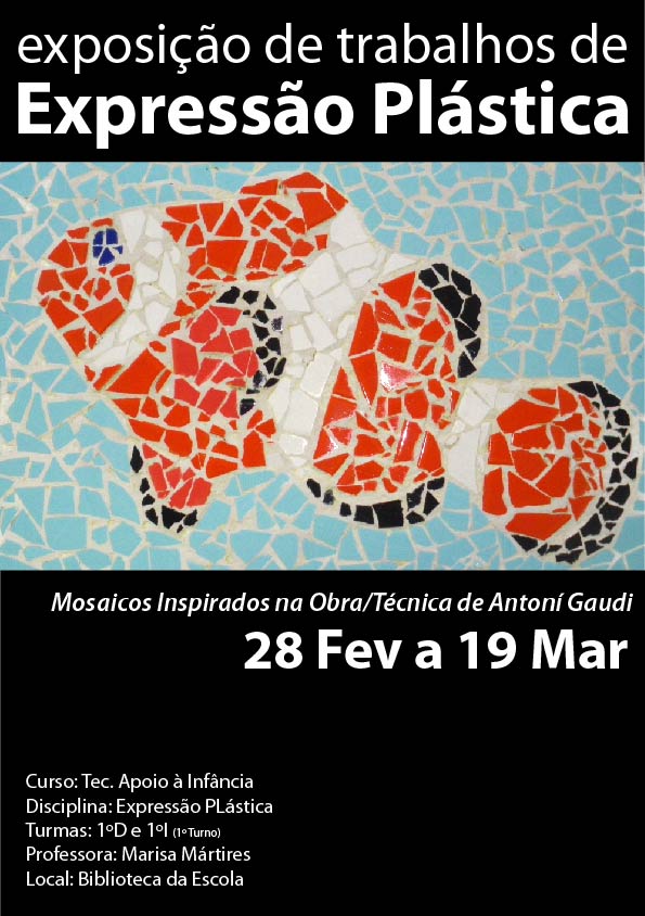 Os alunos do Curso de Técnico de Apoio à Infância das turmas 1ºD e 1ºI convidam toda a comunidade escolar a dirigirem-se à biblioteca da escola para visitarem a exposição de mosaicos que foram realizadas nas aulas de Expressão Plástica. Estes mosaicos, realizados com restos de azulejos partidos são inspiradas na obra/técnica utilizada pelo arquiteto espanhol Antoní Gaudi. A exposição estará patente de 28 de Fevereiro a 19 de Março.
